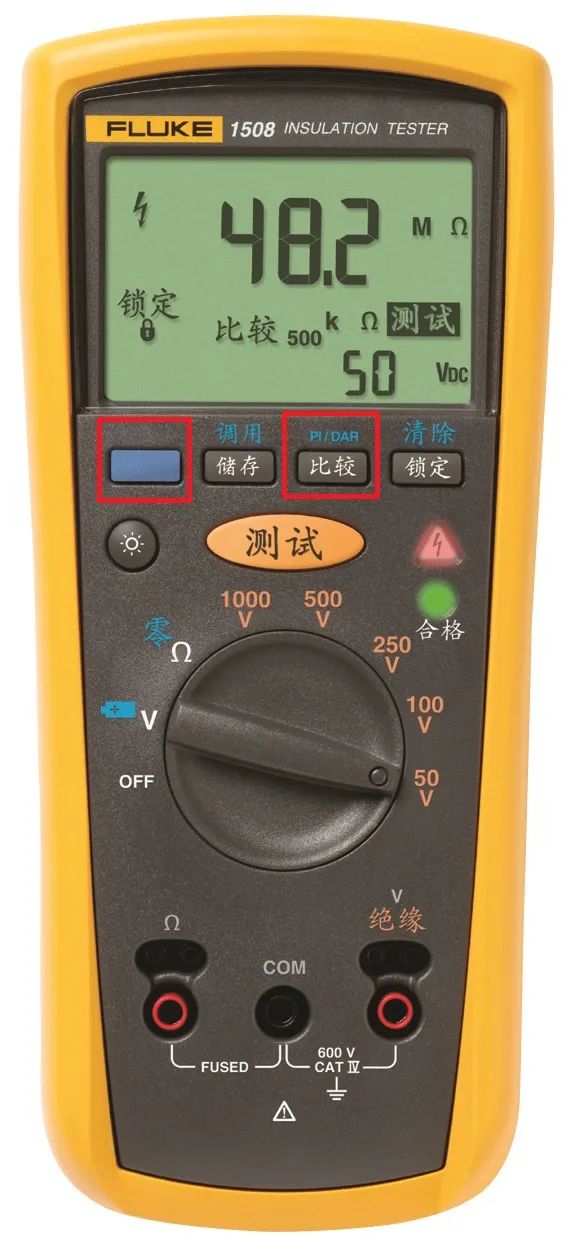 F1508具有極化指數(shù)(PI)和介電吸收比(DAR)測試功能。按下如下圖所示的藍色按鍵和“比較”按鍵即選擇PI或DAR的測試。