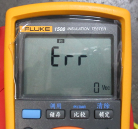 因為極化指數(shù)PI為R10min和R1min比值,介電吸收比DAR為R60s和R30s的比值。如果用于計算 PI 或 DAR 的值中任何一個大于最大顯示量程,或者 1 分鐘值大于 5000 MΩ,主顯示位置將顯示 Err。因為已經(jīng)超過量程再計算比值沒有意義了,說明絕緣情況良好?;蛘呓ㄗh換量程更大的絕緣電阻測試儀。