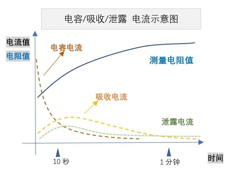 絕緣測試時,大家會發(fā)現(xiàn),測試的數(shù)值隨著時間會不斷變大然后趨于穩(wěn)定,很多時候并不會直接很快顯示一個固定數(shù)值。這是因為絕緣體會產(chǎn)生電容(變小)、吸收(變?。?、泄露(不變)三種電流。