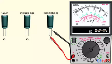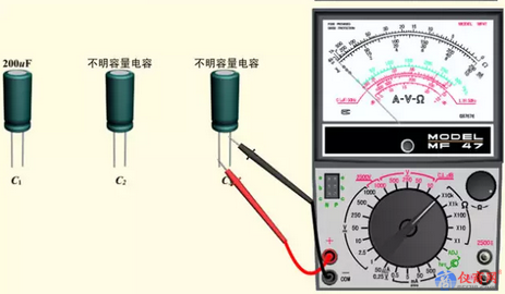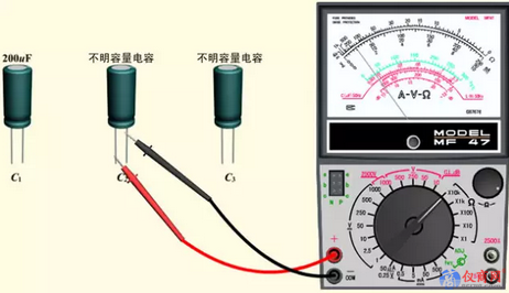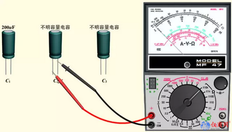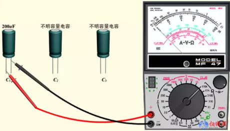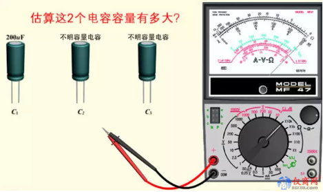 測(cè)電容用電阻擋,根據(jù)電容容量選擇適當(dāng)?shù)牧砍?,并注意測(cè)量時(shí)對(duì)于電解電容黑表筆要接電容正極。