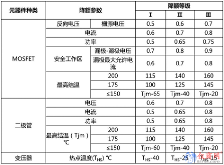 下表所示是電源模塊常用的一些關鍵元器件的降額參數(shù)要求:
