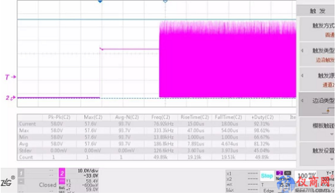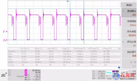圖1 穩(wěn)態(tài)工作時MOS管波形Vds_max=57.2V