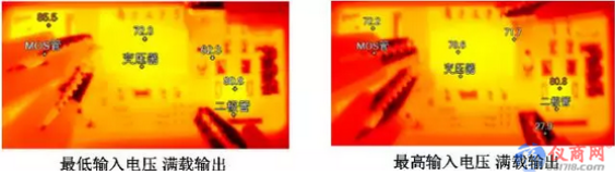 對于還沒灌封的電源模塊,可以采用紅外熱成像儀對整個電源模塊進行“面”的測溫,紅外熱成像儀就是將物體發(fā)出的不可見紅外能量轉(zhuǎn)變?yōu)榭梢姷臒釄D像。熱圖像的上面的不同顏色代表被測物體的不同溫度。然后經(jīng)過分析,再采用熱電偶配合數(shù)據(jù)采集設備重點對MOS管,整流二極管,變壓器等溫升高的關鍵元器件進行“點”的測溫。從面到點,嚴格測試,保證元器件的溫度降額滿足要求。