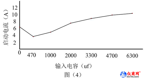 從理論上講,增大電路中的濾波電容 C容量的確可以使輸出電壓的波形變得更為平滑、起伏更小,但在電路接通瞬間,電路中所產(chǎn)生的沖擊電流因素卻不能被忽略;在一些濾波電路的維修中對(duì)濾波電容的替換也存在沖擊電流的問(wèn)題,在不更換其他元件的前提下,單純提高濾波電容的容量會(huì)使整個(gè)電路的實(shí)際使用壽命大大縮短,甚至燒毀整個(gè)電路。況且,單純地提高濾波電容的容量對(duì)改善輸出電壓的作用也是有限的。做一個(gè)簡(jiǎn)單實(shí)驗(yàn)外接不同輸入電容的大小啟動(dòng)時(shí)的電流曲線(xiàn),如下圖(4)所示為輸入外接電容大小與啟動(dòng)電流的關(guān)系曲線(xiàn)。