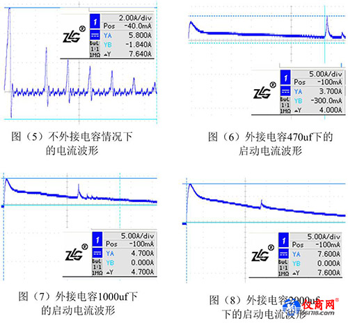 圖(5)-圖(8)為外接電容大小不同的啟動(dòng)電流波形。外接電容在一定情況下,啟動(dòng)電流達(dá)到最低值,對(duì)整個(gè)電路的輸入,輸出環(huán)境有很大的改善。當(dāng)外接電容超過(guò)這個(gè)范圍就會(huì)導(dǎo)致啟動(dòng)電流增大,對(duì)其他器件的威脅也就隨之增大,導(dǎo)致出現(xiàn)不同程度的器件損壞。