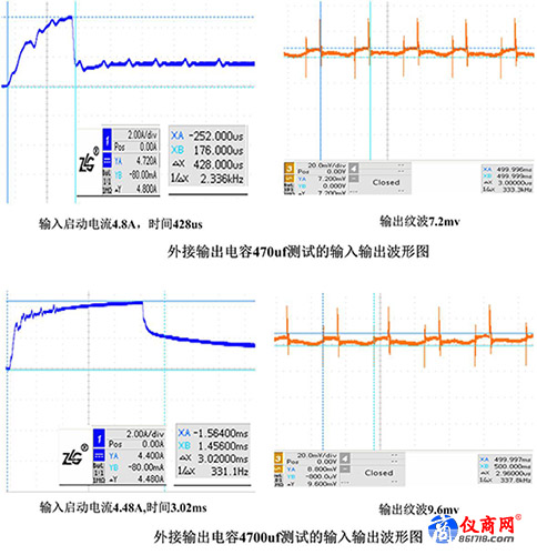 從圖上數(shù)據(jù)可以看出,外接輸出電容容值在一定大小的時(shí)候?qū)y波噪聲起到減小作用,但隨著外接電容的不斷增大紋波噪聲會(huì)處于一個(gè)平衡值。反觀(guān)輸入電流波形,在輸出電容增大情況下啟動(dòng)時(shí),輸入電流維持在大電流時(shí)間會(huì)越長(zhǎng)。假如使用的模塊抗輸入沖擊電流小,這樣就可能導(dǎo)致模塊在一定時(shí)間下受沖擊電流過(guò)大而損壞。所以外接輸出電容也不是越大越好,這要根據(jù)模塊的啟動(dòng)能力和承受電流沖擊能力來(lái)選定的。