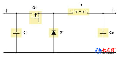 圖1是非同步降壓轉(zhuǎn)換器的原理圖。降壓轉(zhuǎn)換器將其輸入電壓降低為較低的輸出電壓。當(dāng)開關(guān)Q1導(dǎo)通時(shí),能量轉(zhuǎn)移到輸出端。