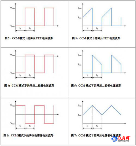 圖2至圖7顯示了非同步降壓轉(zhuǎn)換器中FET、二極管和電感器在連續(xù)導(dǎo)通模式(CCM)下的電壓和電流波形。