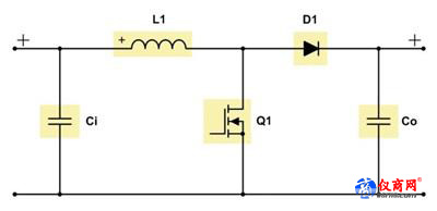 升壓轉(zhuǎn)換器將其輸入電壓升高為更大的輸出電壓。當(dāng)開關(guān)Q1不導(dǎo)通時(shí),能量轉(zhuǎn)移到輸出端。圖8是非同步升壓轉(zhuǎn)換器的原理圖。