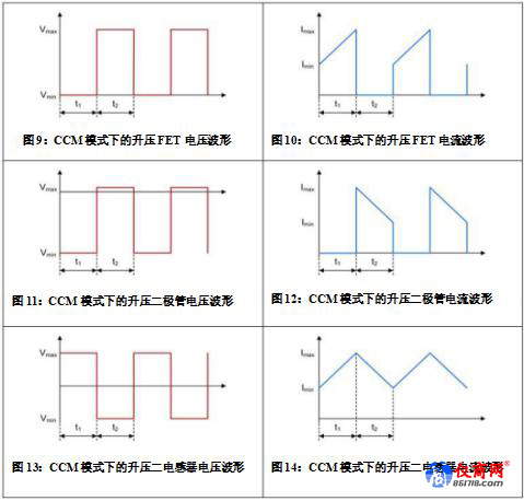 圖9至圖14顯示了非同步升壓轉(zhuǎn)換器中FET、二極管和電感器在CCM模式下的電壓和電流波形。