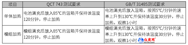 相比于QC/T 743-2006,GB/T 31485-2015 增加了單體還誰侵泡,單體溫度循環(huán)、單體低氣壓、模組跌落、模組海水侵泡、模組溫度循環(huán)、模組低氣壓等7項(xiàng)新的檢驗(yàn)要求。針對(duì)大部分檢驗(yàn)項(xiàng)目、GB/T 31485-2015 均做了提高或強(qiáng)化,并要求測(cè)試結(jié)束后,必須觀察1小時(shí),才能確定檢驗(yàn)是否合格。就電池單體&模組的測(cè)試項(xiàng)目的對(duì)比如下: