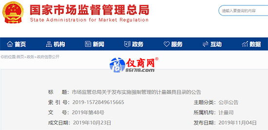【儀器儀表行業(yè)門戶儀商網(wǎng)】11月4日,國(guó)家市場(chǎng)監(jiān)督管理總局網(wǎng)站發(fā)布的《實(shí)施強(qiáng)制管理的計(jì)量器具目錄》公告,內(nèi)容涉及60多項(xiàng)計(jì)量器具及儀器儀表。