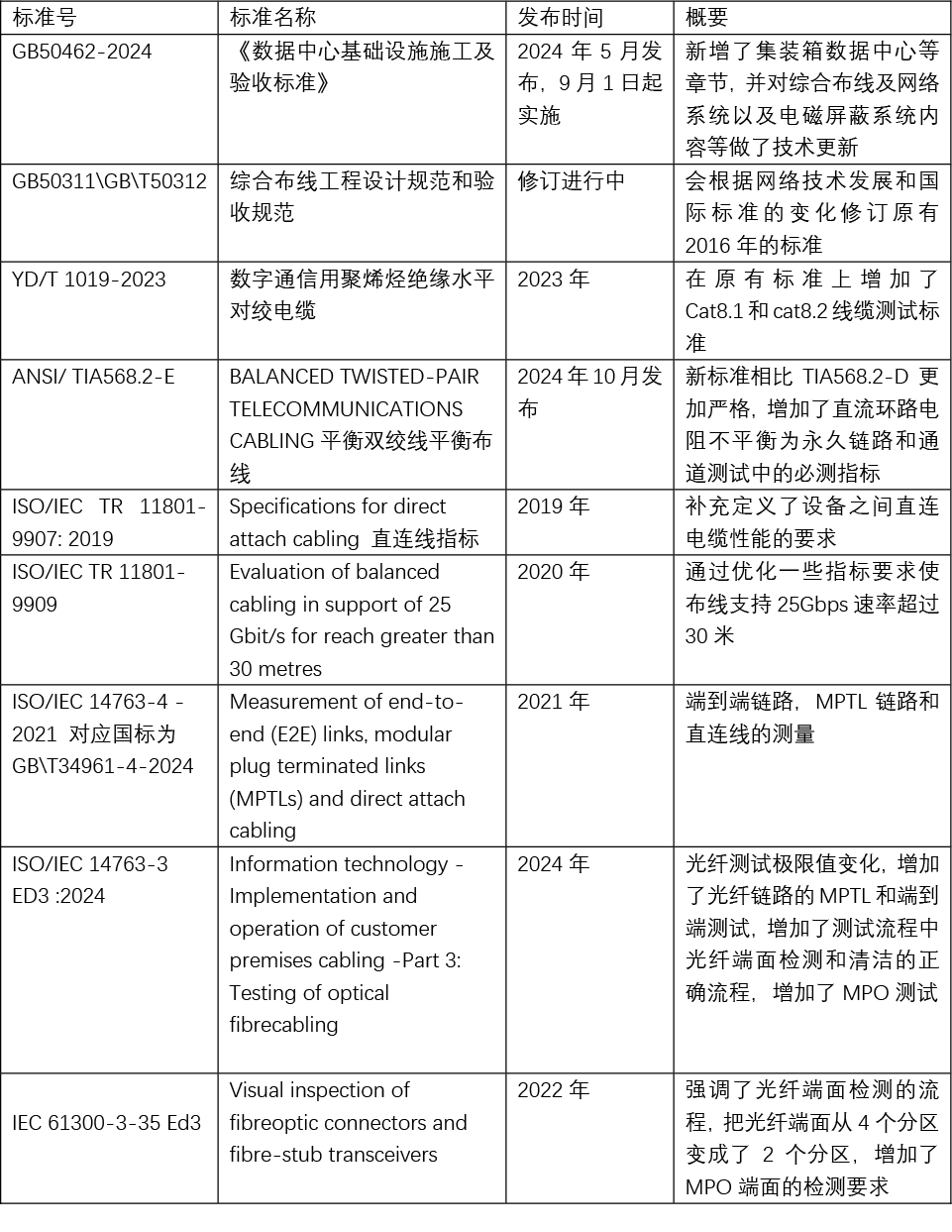 網(wǎng)絡(luò)技術(shù)快速迭代推動(dòng)了國際國內(nèi)行業(yè)布線技術(shù)標(biāo)準(zhǔn)的更新,新的技術(shù)標(biāo)準(zhǔn)和測試需求也是在確保數(shù)據(jù)中心網(wǎng)絡(luò)穩(wěn)定性方面扮演著至關(guān)重要的角色。標(biāo)準(zhǔn)的變化包括銅纜測試內(nèi)容和光纖測試極限值以及光纖端面檢測標(biāo)準(zhǔn)等多個(gè)方面,為打造更為穩(wěn)定可靠的網(wǎng)絡(luò)基建提供了技術(shù)支撐。