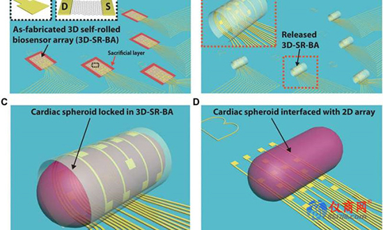 來自卡內(nèi)基梅隆大學(xué)和南洋理工大學(xué)的研究人員開發(fā)了一種自動(dòng)滾動(dòng)的3D生物傳感器陣列,用于測量心臟細(xì)胞的電生理學(xué)。