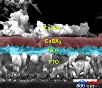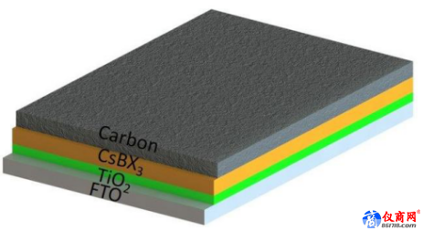 如下圖所示,這種全無機鈣鈦礦太陽能電池具有幾層。底層是僅有幾毫米厚的玻璃,第二層是透明導電材料FTO,接下來是由二氧化鈦組成的電子活性層,第四層是光敏鈣鈦礦,頂層是碳。