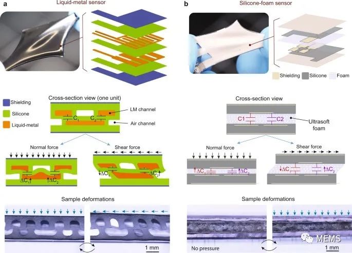 由于屏蔽和感應(yīng)電極之間的寄生電容會在傳感器變形時發(fā)生變化,為了解決這一問題,研究人員實施了兩種不同的設(shè)計策略,實現(xiàn)了具備屏蔽特性的柔性電容式傳感器:基于液態(tài)金屬(LM)微結(jié)構(gòu)的設(shè)計和基于超軟硅膠泡沫(SF)的設(shè)計。這兩種傳感器具有相似的設(shè)計原理:外部兼容屏蔽電極密封在一個非常柔軟的感應(yīng)區(qū)域,其他區(qū)域是相對較硬的無源部分。該結(jié)構(gòu)旨在使傳感器可以感應(yīng)微弱力信號,同時最大限度地減少內(nèi)部和外部寄生電容的影響。當(dāng)施加力時,感應(yīng)區(qū)域中電極的相對位置會發(fā)生變化,從而導(dǎo)致電容發(fā)生變化。研究人員通過設(shè)計優(yōu)化,使該傳感器單位電容變化最大化,同時確保其形狀的靈活性和可拉伸性,能夠輕松集成在非平面表面上。