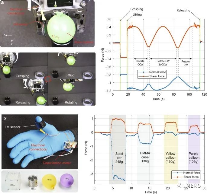 通過研究對比,證明了LM傳感器在正常負載和剪切負載下比SF傳感器具有更好的耐用性。因此,研究人員基于LM傳感器展示了其應(yīng)用效果。
