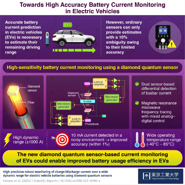 幸運的是,一組來自日本東京工業(yè)大學的科學家已經(jīng)找到了解決辦法。他們近期在《科學報告》雜志上報告了一種基于鉆石量子傳感器的檢測技術,該技術可以在測量電動汽車大電流時,以1%的精確度估計電池電量。
