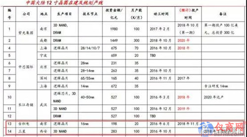 目前,國內(nèi)在建共計21條12寸晶圓產(chǎn)線,包括漢新芯第二期、合肥長鑫十二寸DRAM工廠、臺積電南京晶圓代工廠、德科瑪淮安十二寸廠等。從建廠的上看,國際巨頭英特爾、三星、IBM等廠商也已經(jīng)陸續(xù)在中國大陸建設工廠或代工廠。