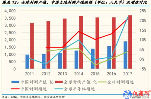 其中,封測的技術含量相對較低,大陸企業(yè)最早以此為切入點進入集成電路產(chǎn)業(yè),因此多年來封測業(yè)銷售額在集成電路產(chǎn)業(yè)中的占比一直較高,封測產(chǎn)業(yè)增速遠高于全球平均水平。