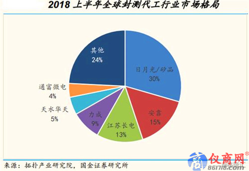 企業(yè)角度來看,全球封測前十大廠商中國臺灣占據(jù)5家、中國3家、美國1家以及新加坡1家。2018年上半年,來自中國臺灣的日月光和矽品兩家公司總和營收占比最高,達到30%。中國大陸廠商排名前三的企業(yè)分別為:長電科技、華天科技、通富微電。國內(nèi)龍頭長電科技則是全球第三大封測廠商。