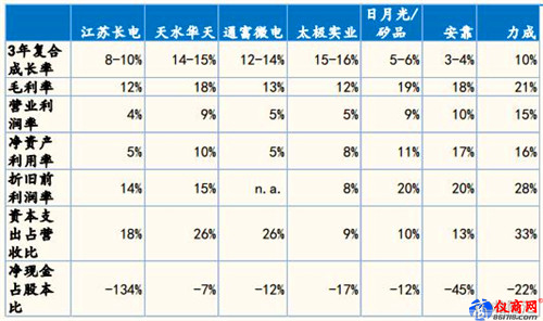 國內(nèi)封測企業(yè)與國外巨頭們相對比,我們會發(fā)現(xiàn)國內(nèi)三巨頭的3年復合增長率比國外要高出一個檔次。如果國內(nèi)企業(yè)自相對比的話,可以發(fā)現(xiàn)華天科技的3年復合成長率和毛利率的表現(xiàn)更為突出。