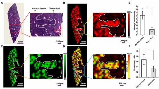 納米材料可用作藥物載體,我們最近用質(zhì)譜成像技術研究納米載體藥物的釋放。我們選擇硫化鉬納米材料,觀察硫化鉬的信號即可得到納米材料在體內(nèi)的分布。選擇的藥物是紫杉醇,觀察其信號可得到藥物在體內(nèi)的分布。我們用質(zhì)譜成像發(fā)現(xiàn)了一個有趣的現(xiàn)象:一般人認為腫瘤里面的材料多,但通過質(zhì)譜成像發(fā)現(xiàn),腫瘤里的材料很少,正常組織中材料多;腫瘤組織里面藥物釋放多,正常組織藥物釋放少,與人們想象的結(jié)果相反。