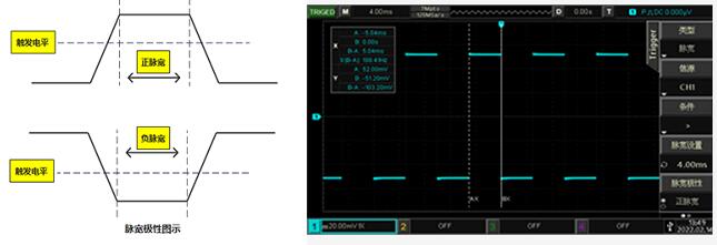 在示波器中,觸發(fā)電平與正脈沖相交的兩點(diǎn)間時(shí)間差定義為正脈寬,觸發(fā)電平與負(fù)脈沖相交的兩點(diǎn)間時(shí)間差定義為負(fù)脈寬。