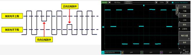 指的是同時(shí)設(shè)置高低電平門(mén)限,用于觸發(fā)跨過(guò)了一個(gè)觸發(fā)電平但沒(méi)有跨過(guò)另一個(gè)觸發(fā)電平的脈沖。正極性欠幅脈沖是指跨過(guò)了觸發(fā)電平下限但沒(méi)有跨過(guò)觸發(fā)電平上限的脈沖;負(fù)極性欠幅脈沖是指跨過(guò)了觸發(fā)電平上限但沒(méi)有跨過(guò)觸發(fā)電平下限的脈沖。