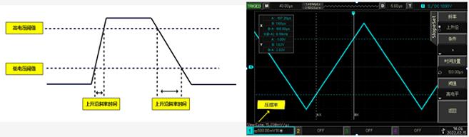 斜率觸發(fā)的關(guān)鍵是要設(shè)定正確的壓擺率,當(dāng)信號(hào)上升或下降的壓擺率符合設(shè)定值時(shí)即產(chǎn)生觸發(fā)。