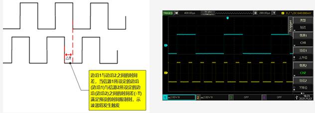 (1)>:信源1所設(shè)定的邊沿與信源2所設(shè)定的邊沿之間的時(shí)間差(△T)大于設(shè)置 的時(shí)間觸發(fā)。