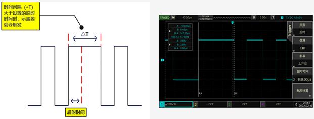 超時(shí)觸發(fā)指的是觸發(fā)從輸入信號(hào)的上升沿(或下降沿)跨過(guò)觸發(fā)電平開(kāi)始到相鄰的下降沿(上升沿)跨過(guò)觸發(fā)電平結(jié)束的時(shí)間間隔(△T)大于設(shè)置的超時(shí)時(shí)間時(shí)的信號(hào)。