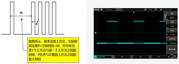選擇N邊沿觸發(fā),在指定空閑時(shí)間后第N個(gè)邊沿上觸發(fā)。例如,在如下圖所示的波形中,需在指定空閑時(shí)間(相鄰兩個(gè)上升沿之間的時(shí)間)后第1個(gè)上升沿上觸發(fā),則空閑時(shí)間需設(shè)置為P<空閑時(shí)間