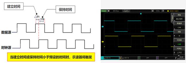 選擇建立保持觸發(fā),在此觸發(fā)類型下,需要設(shè)置數(shù)據(jù)信號(hào)線和時(shí)鐘信號(hào)線。建立時(shí)間從數(shù)據(jù)信號(hào)跨過(guò)觸發(fā)電平時(shí)開(kāi)始,至指定的時(shí)鐘邊沿到來(lái)時(shí)結(jié)束;保持時(shí)間從指定的時(shí)鐘邊沿到來(lái)時(shí)開(kāi)始,至數(shù)據(jù)信號(hào)再次跨過(guò)觸發(fā)電平時(shí)結(jié)束。當(dāng)建立時(shí)間或保持時(shí)間小于預(yù)設(shè)的時(shí)間時(shí),示波器將觸發(fā)。建立保持觸發(fā)的關(guān)鍵是選擇一個(gè)通道信號(hào)作為數(shù)據(jù)源,再選擇另外一個(gè)通道信號(hào)作為時(shí)鐘源。