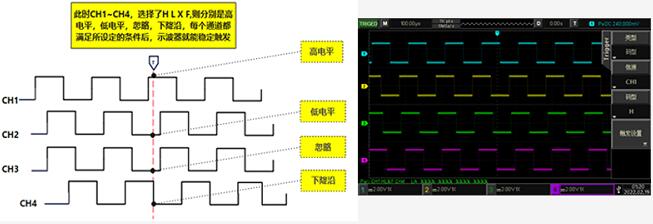 對(duì)于不同通道的輸入信號(hào),實(shí)現(xiàn)一個(gè)通道信號(hào)滿足一種條件,同時(shí)另一個(gè)通道波形滿足另一種條件,即實(shí)現(xiàn)通道的邏輯“與”組合,每個(gè)通道可以設(shè)置為H(高)、L(低)、X(忽略)。您還可以指定碼型中的一個(gè)通道為上升沿或下降沿(僅可指定一個(gè)邊沿)。當(dāng)指定邊沿后,如果其它通道的碼型均判定為"真"(即實(shí)際碼型與預(yù)設(shè)的碼型一致),示波器將在該指定邊沿上觸發(fā)。如果未指定邊沿,示波器將在使碼型為"真"的最后一個(gè)邊沿上觸發(fā)。如果所有通道的碼型都被設(shè)置為"忽略",示波器將不會(huì)觸發(fā)。