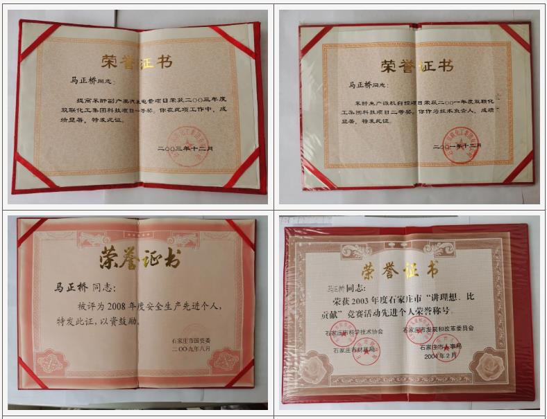 由于馬正橋在白龍化工企業(yè)安全方面的出色工作,他被越來(lái)越多的人熟知和認(rèn)可,在省內(nèi),乃至國(guó)內(nèi)業(yè)界都有了一定知名度,期間曾榮獲石家莊市級(jí)科技工作先進(jìn)個(gè)人、市發(fā)改委優(yōu)秀科技管理一等獎(jiǎng),市級(jí)五一勞模等榮譽(yù),公司科技項(xiàng)目一等獎(jiǎng),二等獎(jiǎng)等。