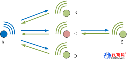 3、如圖 9所示,當(dāng)主從節(jié)點(diǎn)的距離無法直接通訊時(shí),只需將兩點(diǎn)距離中一個(gè)節(jié)點(diǎn)(如C點(diǎn))設(shè)置成路由模式,則能完成數(shù)據(jù)轉(zhuǎn)發(fā),其他所有設(shè)置均和第2點(diǎn)的設(shè)置一樣。