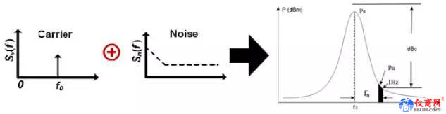 相位噪聲反映的是單載波信號(hào)的頻譜純度,如果沒(méi)有相位噪聲,信號(hào)的所有功率都應(yīng)集中在其振蕩頻率f0處(下圖左Carrier),這個(gè)理想信號(hào)用Asin(ωt)表示。由于存在相位噪聲(下圖左Noise),相當(dāng)于在理想信號(hào)上調(diào)制了一個(gè)Φ(t)相位信號(hào),此時(shí)整個(gè)信號(hào)表示為Asin(ωt+Φ(t))。在頻譜上體現(xiàn)為一部分功率擴(kuò)展到相鄰的頻率中去,形成邊帶(下圖右)。相噪定義為單邊帶某一給定偏移頻率fn處1Hz帶寬內(nèi)的功率Pn與信號(hào)總功率Ps比值的對(duì)數(shù),即 10lg(Pn/Ps),相噪以dBc/Hz@fn為單位來(lái)表示。這里dBc的含義是某頻點(diǎn)功率與信號(hào)總功率的比值(下圖右),對(duì)應(yīng)于時(shí)鐘相位偏移與時(shí)鐘周期的比值。