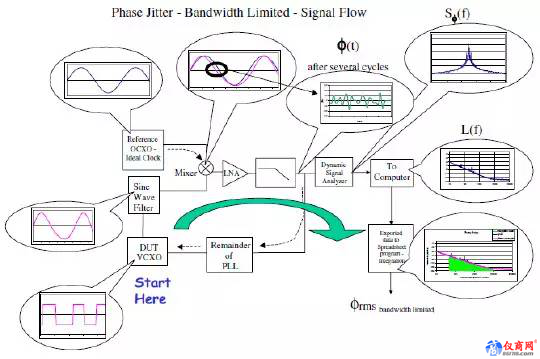 頻譜分析法是對(duì)時(shí)鐘信號(hào)進(jìn)行頻譜分析,先測(cè)量信號(hào)總功率Ps,再測(cè)量某一偏移頻率出的功率Pn,再經(jīng)過(guò)計(jì)算便可得到該被測(cè)時(shí)鐘的單邊帶相位噪聲。頻譜分析法是一種簡(jiǎn)單直接的相噪分析技術(shù),適宜于測(cè)量漂移較小但相位噪聲相對(duì)較高的信號(hào);但是頻譜分析法不能分辨出調(diào)幅噪聲和相位噪聲,測(cè)試波形不太完美的時(shí)鐘信號(hào)相噪時(shí)會(huì)存在較大誤差;另外由于頻譜儀的動(dòng)態(tài)范圍和最小分辨帶寬的限制,測(cè)量精度受限。