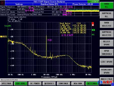 從下面的測量可以得到10Hz到30MHz的積分相噪是-51.5dBc,以該測量為例計算: