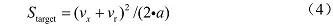 假設(shè)自車當前的車速為 v_x,m/s,目標車輛相對于自車的速度為 v_r,m/s,減速度常數(shù)為 a,m/s^2,自車從當前位置以減速度 a 進行制動,所需要的制動距離為: