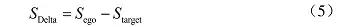 如圖 4 所示,當目標車比自車慢,即 v_r < 0 時,若 2 車以同樣的減速度 a 同時開始制動,自車完全停止所需要的制動距離比目標車完全停止所需要的制動距離長 S_Delta,即: