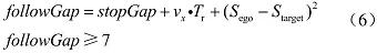 即當目標車輛開始減速時,如果自車駕駛員能夠立即采取制動措施,那么需要 2 車制動前的距離不小于 S_Delta 才能保證 2 車剛好不相撞。在實際情況中,從前車開始制動到自車駕駛員開始采取制動措施之間,一定會存在一段時間間隔,定義這段時間為駕駛員的反應(yīng)時間 T_r [5]。同時,圖 4 中為一種剛好不碰撞的臨界狀態(tài),為提高安全系數(shù),應(yīng)該保證 2 車完全停止后,二者之間仍然存在一段距離,定義為停止距離 stopGap。