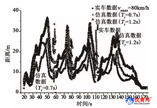 圖 6 不同反應(yīng)時間下跟車距離與實際跟車距離對比