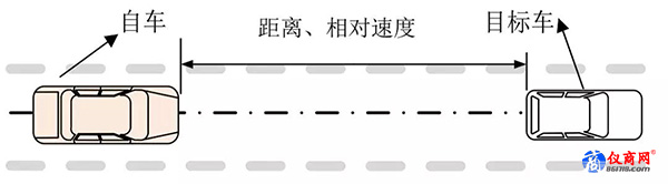 ACC 系統(tǒng)通過獲得自車運動狀態(tài)(車速、加速度、轉(zhuǎn)向盤轉(zhuǎn)角)、駕駛員意圖(轉(zhuǎn)向盤轉(zhuǎn)角、油門踏板開度、制動踏板開度)等車輛內(nèi)部狀態(tài)信息,進行車輛運動估計和駕駛員意圖估計,然后指導雷達、相機等傳感器進行信號處理和信息融合,提高識別的準確率和算法的運算效率,確定有效的跟隨目標 。確定有效目標后,獲得跟隨目標的距離、相對速度(相對自車)等信息,如圖 2 所示。