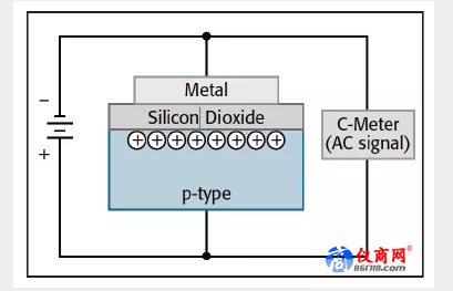 進(jìn)行C-V 測量時,通常在電容兩端施加直流偏壓,同時利用一個交流信號進(jìn)行測量。一般這類測量中使用的交流信號頻率在10KHz 到10MHz 之間。所加載的直流偏壓用作直流電壓掃描,掃描過程中測試待測器件待測器件的交流電壓和電流,從而計(jì)算出不同電壓下的電容值。