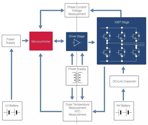 圖5 混合動力汽車/電動汽車中的英飛凌主逆變器框架圖