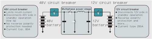 管理好混合動力汽車和電動汽車中的電池要求使用高壓技術(shù)。結(jié)合了12V和48V電池的雙電壓系統(tǒng)需要雙向的直流/直流轉(zhuǎn)換,如圖6所示,目的是保護電路,支持架構(gòu)化功能。