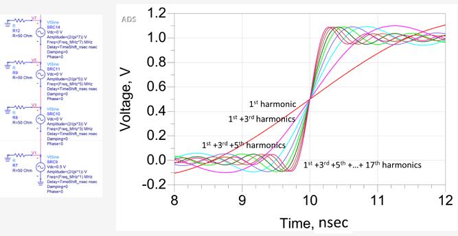 可以在時(shí)域中仿真多個(gè)不同頻率的正弦波,并使用一個(gè)簡(jiǎn)單的電路將理想的正弦波電壓源串聯(lián)在一起。使用理想的 100 MHz 方波的分析計(jì)算幅度,下圖顯示了電路以及前 17 個(gè)諧波分量相加得到的時(shí)域波形?;l是 100 MHz,每個(gè)諧波都是 100 MHz 的倍數(shù),偶次諧波的幅度為 0。隨著更高頻率分量添加到波形中,信號(hào)的上升時(shí)間減小, 它們是負(fù)相關(guān)的。