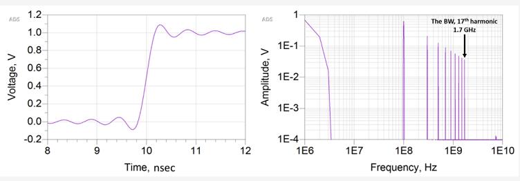 例如,具有前 17 個(gè)諧波分量的波形和該時(shí)域波形的頻譜如下圖所示,該波形的帶寬設(shè)計(jì)為 1.7 GHz。